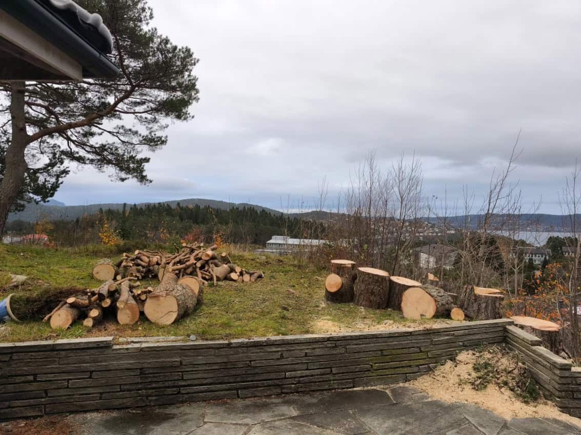 Vi feller trær og busker uansett størrelse og plassering. Med klatring og rigging får vi kontrollert håndtert trær på steder der lift eller kranbil ikke er egnet. Etter felling kan vi flise treet, legge fra oss stammer klare til kløyving eller levere ved i sekker på tomten din.